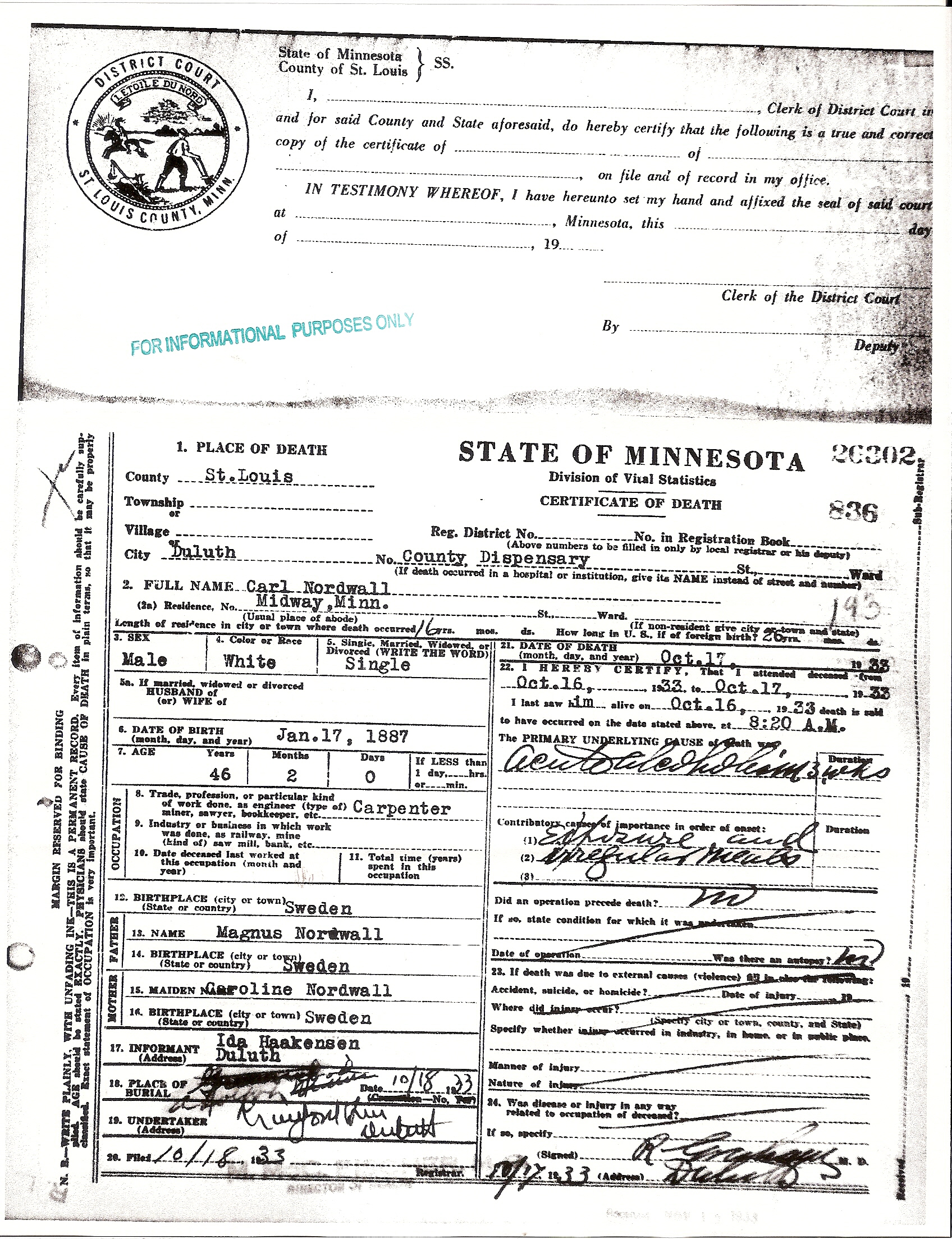 Personligen tror jag att det var “den stora depressionen” som satte sitt sigill på Carls öde. Carl bor sina sista 16 år i Duluth. Carl gifter sig aldrig och dör bara 46 år gammal på sjukhuset i Duluth. Han har då levt 26 år i Amerika. Dock finns det en kanske norsk dam Ida Haakensen eller hennes namn kankse bara blivit felstavat som var väldigt vanligt. Men Ida måste ha kännt Carl väl eftersom Ida dyker upp på hans dödscertifikat från sjukhuset.